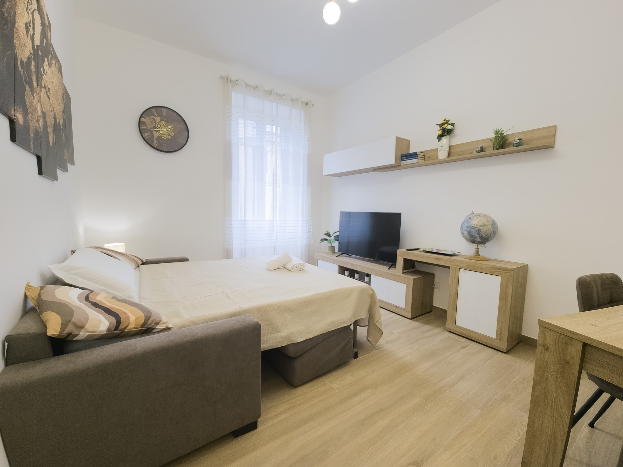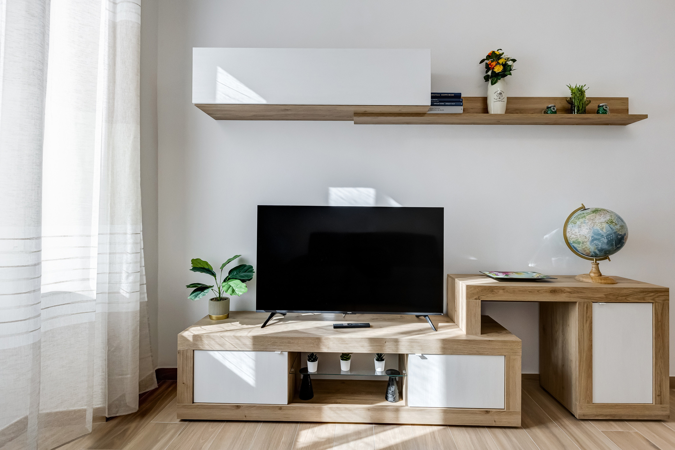 As you step inside, you’ll be welcomed by a small entrance leading to a bright double bedroom with a smart TV — perfect for relaxing after a day of exploring. The living room is spacious and comfortable, featuring a cozy sofa bed, a dining area with table and chairs, and another smart TV for your downtime.